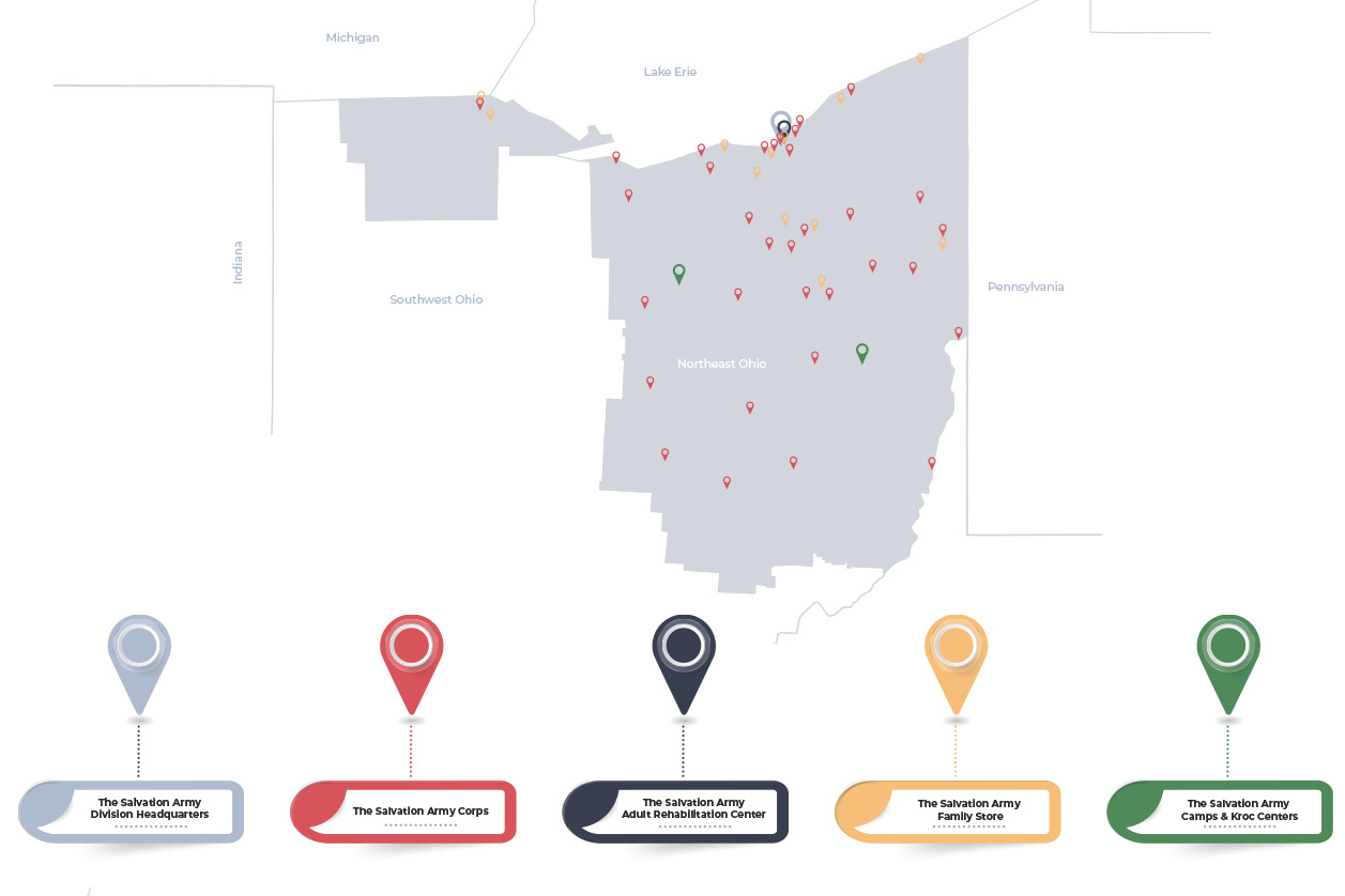 Embodying the region’s reputation for warm hospitality and close sense of community, The Salvation Army is beloved and respected, present amid intensely urban blocks and isolated rural farmland. Here we find the Ashland Kroc Center, the Cleveland Harbor Light Center, and beloved Camp NEOSA. Well-attended divisional events are characterized by a family-friendly atmosphere and hearty gospel singing. It is contagious.